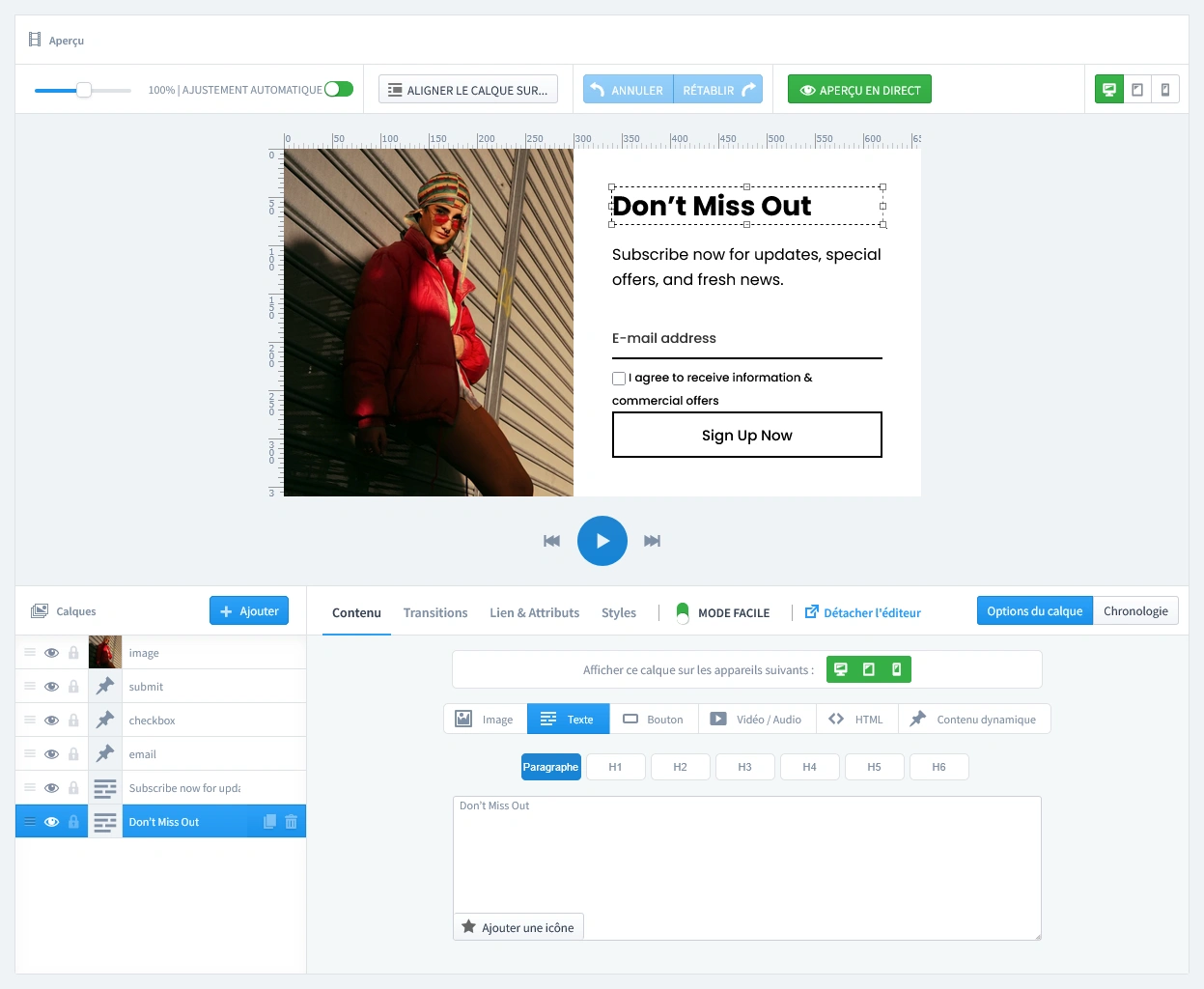 - Le formulaire d'inscription (premier onglet) : c'est la vue principale. Créez une offre convaincante avec un titre fort, un champ email et un bouton d'inscription clair. Personnalisez facilement couleurs, police et image selon le design de votre boutique.
