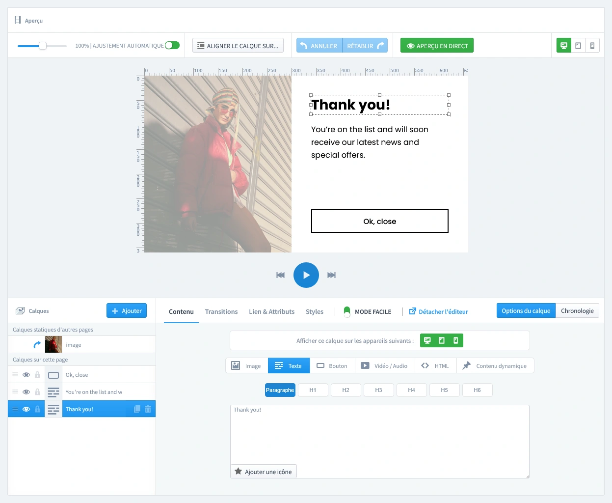 Sélectionnez "Ouvrir automatiquement après 6 secondes". Cela laisse le temps aux visiteurs de découvrir la page avant l'affichage du popup, pour une expérience plus naturelle et moins intrusive.