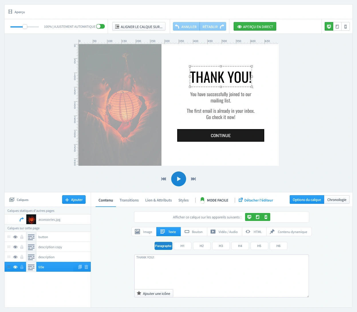 - La page de remerciement (Deuxième onglet): Cette page s’affiche automatiquement après une inscription réussie. Utilisez-la pour remercier l’utilisateur et confirmer son abonnement.