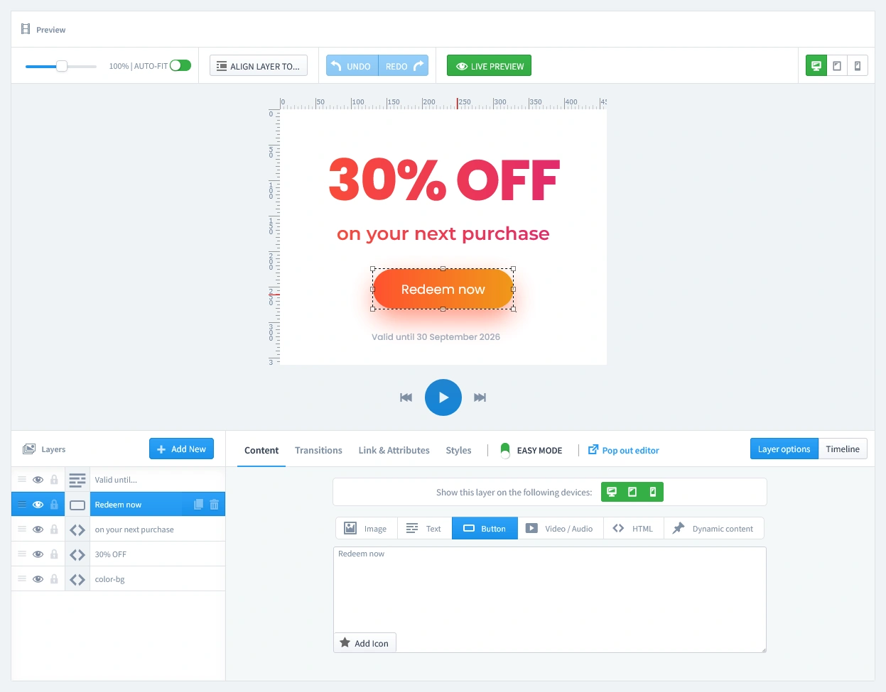- The Coupon Reveal Page (Second Tab): This page appears after the user clicks the "Redeem Now" button. Switch to this view in your editor. The crucial step is here: make sure you enter the coupon code you created in Step 0 into the designated "coupon" layer of the popup. This will display the correct code for your customer to use.