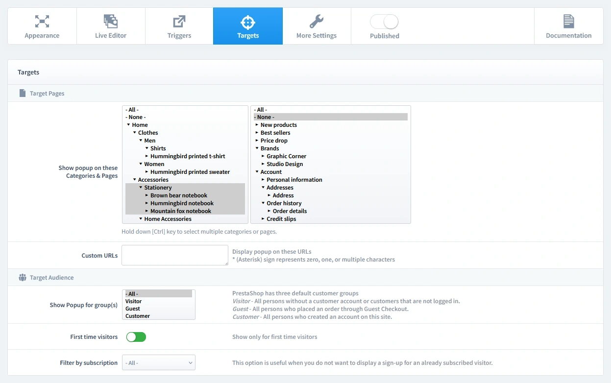 Now that we've set when the popup appears, it's time to define who sees it and on which pages. Let's begin by clicking on the Targets tab.