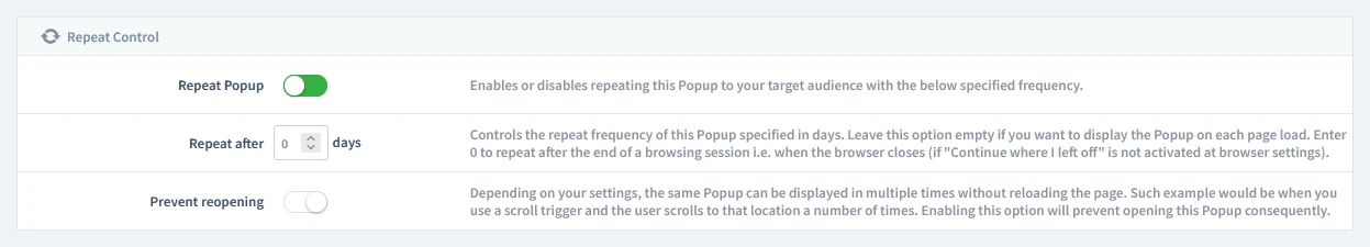 To prevent showing the same popup to a visitor too often, choose Repeat once in a browser session. To set this up, enable "Repeat Popup" and set the "Repeat after" value to 0 days.